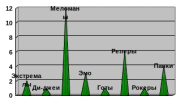 В своем исследовании мы выявили 30 представителей неформальных молодежных объединений, что говорит о том, что каждый четвертый подросток принадлежит к той или иной субкультуре. Эти тридцать подростков неравномерно распределились по восьми субкультурам. А именно: реперы, панки, готы, эмо, меломаны, ди-джеи, экстрималы, рокеры. Уровень представленности в нашем городе тех или иных субкультур можно проследить по следующей диаграмме.