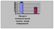 В классах, где был высок процент неформальной молодёжи, обычные их сверстники, как раз оценивали своё отношение к тем, кто является представителем субкультур в основном положительно, хотя и выражали негатив по отношению к самим неформальным объединениям. Может кто-то просто не знает, что его одноклассник причисляет себя к той или иной группе неформалов, а, возможно, мы становимся более терпимыми по отношению к этим людям, когда больше общаемся с ними, лучше узнаем их и видим, что между нами больше сходств, чем различий. Подсчитав оценки, я увидела, что в среднем отношение к представителям неформальных объединений среди молодежи положительно.
