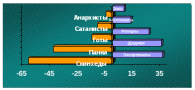 В целом можно выделить незначительное преобладание «позитивных» субкультур над «негативными» (235 выборов, против 225-ти). Субкультур деструктивным поведением выделено меньше, и в основном все отрицательные выборы сосредоточены на нескольких субкультурах представленных на диаграмме. Список позитивно настроенных субкультур больше, но значения по каждой субкультуре меньше. Эти выводы подтверждают и описательные характеристики субкультур, которые анализировались выше.