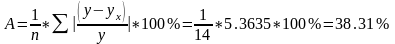 Соответственно доверительный интервал прогноза составит: уp+t*Sp, где t-табличное значение t-критерия Стьюдента. При ά=0,05 и числе степеней свободы n-3= 11 t=2,2010.
