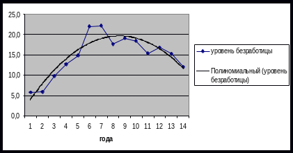 У=280,1/14=20,01%, т.е. за период 1992-2005гг. ежегодно уровень численности безработных составила 20,01%.