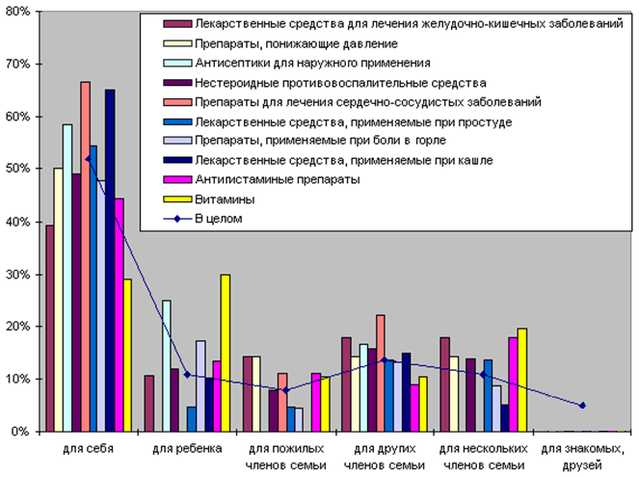 Наибольшая доля покупок приходится только для себя. Как правило, лекарственные средства используют для самолечения таких заболеваний, как насморк, простуда, головная боль, кашель, зубная боль, боль в горле, нарушение пищеварения, несварение, гипертония, порезы, ссадины, угревая сыпь, герпес. Витаминные препараты (около 30% покупок) как правило, приобретаются либо только для детей, либо для применения несколькими членами семьи одновременно. Так же для детей приобретаются противопростудные препараты. Для пожилых членов семьи в основном приобретаются препараты для лечения желудочно-кишечных заболеваний и гипотензивные средства.
