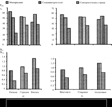 На систему життєвих цінностей впливають різні фактори. Наприклад, із зростанням кваліфікації й активності співробітників збільшується відсоток респондентів, для яких найбільш важливими є цінності трудоцентриста і соціоцентриста (рис. 2). Якщо тепер розрахувати відносні показники, тобто показники ролі розглянутих цінностей Пса і Пс, то виявиться, що вони ростуть ще швидше. Це пояснюється тим, що для більш активних людей, принаймні в розглянутому випадку, зменшується значимість матеріальних цінностей.