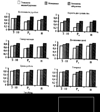 При переході від "Технології машинобудування" до "Менеджменту" і далі до "Економічної кібернетики" ціннісні орієнтації студентів змінюються таким чином (рис. 6), що це свідчить про зростання їх активності, рівня самосвідомості.