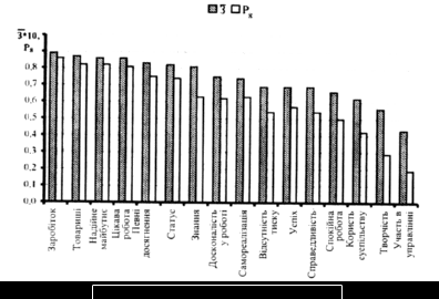 Таким чином, у порівнянні з оцінкою життєвих цінностей (див. рис. 1) оцінка важливості трудових цінностей характеризує респондентів як більш приземлених, у яких деякі духовні цінності менші, а матеріальні — більші. Це пояснюється декількома причинами.