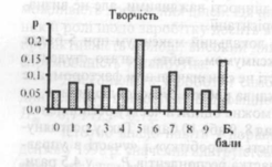 Раніше зазначалося, що за середнім значенням значимості, а також за кількістю респондентів, для яких можливість творчості є високозначимою, ця цінність займає одне з останніх місць у списку. Але якщо звернутися до розподілу значимості, то буде видно, що для 15% студентів цінність "творчість" є однією із найголовніших (ВЗ - 10 балів). Виявлені 47 із 316 людей, які прагнуть до творчої діяльності, — це не так вже й мало.