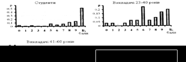 Негативні факти були виявлені при аналізі розподілів показника прагнення до досягнення цілей (рис. 8). Кількість людей, для яких найголовніше — чогось досягти, знижується у викладачів у віці 25-40 років порівняно зі студентами в 2,5 рази, а у викладачів у віці 41-60 років — у 5,4 рази. 15% респондентів останньої вікової групи поставили в анкеті 0 балів, що за умовою опитування означає: "Не можу або не бажаю відповідати".
