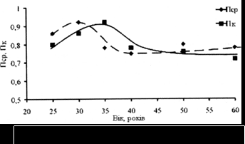 Важливість самореалізації в оцінці верстатників росте до 30 років, а потім знижується і далі змінюється мало. Прагнення приносити користь для людей змінюється у такий же спосіб, але максимум спостерігається у 35 років. Певною мірою повторюються залежності, отримані для викладачів (див. рис. 3), але "моральне старіння" верстатників починається раніше. Таке старіння пояснюється і суто віковими змінами, і специфікою праці верстатника, на відміну від викладача, але для розгляду проблематики важлива констатація іншої причини: система мотивації верстатників має потребу в подальшому удосконалюванні.