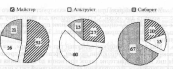 Надаючи великого значення виявленню трудових типів у тій чи іншій професійній групі або організації, не слід забувати, що у чистому виді ці типи зустрічаються рідко, а психологічний портрет конкретної людини — це баланс розглянутих цінностей. На рис. 10 портрет подано як значимість цінностей, які визначають різні трудові типи, характерні для студентів. На всіх діаграмах домінуючі типи виділені відокремленням відповідного сектора. Приймаючи рішення у сфері своєї трудової або навчальної діяльності, людина вирішує багатокритеріальну задачу, ніби використовуючи принцип голосування, але підштовхнути її у позитивному напрямку повинна висока корпоративна культура всієї організації та її підрозділу, в якому вона працює або учиться.