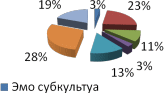 В нашем Колледже был проведён опрос среди учащихся студентов. Из 139 опрошенных человек четверо увлекались эмо субкультурой, рэпом – тридцать один студент, роком и металлом – четырнадцать, готической субкультурой – четыре студента, хип-хопом – восемнадцать студентов, другими направлениями – тридцать восемь, не увлекались вообще – двадцать шесть учащихся. Результаты приведены на графике.