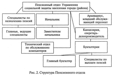 Пенсионный отдел является структурным подразделением Управления социальной защиты населения. Пенсионный отдел города или района организует свою работу или по участковой системе, или с применением функциональной специализации.