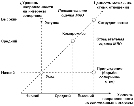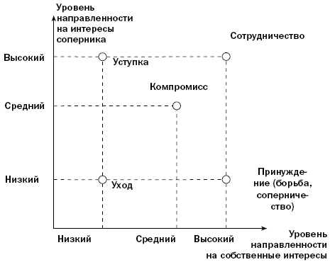 В любом конфликте каждый участник оценивает и соотносит свои интересы и интересы соперника, задавая себе вопросы: «Что я выиграю…?», «Что я потеряю…?», «Какое значение имеет предмет спора для моего соперника…?». На основе такого анализа он сознательно выбирает ту или иную стратегию поведения (уход, принуждение, компромисс; уступка или сотрудничество). Оценка интересов в конфликте – это качественная характеристика выбираемого поведения. В модели Томаса-Килмена она соотносится с количественными параметрами: низким, средним или высоким уровнем направленности на интересы.