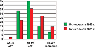 Бизнес-элита — молодая социальная группа российского общества, и члены этой группы молоды. "Так, если средний возраст позднесоветской элиты (1985 г.) равнялся 56,6 года, а горбачевской элиты (1990 г.) — 52,2 года, то возникшая в 1987 году группа "номенклатурных предпринимателей" была на 10 лет моложе" [4, 46]. Ее средний возраст достигал 42,1 года. Это была самая молодая из всех субэлитных групп постперестроечной поры, хотя надо отметить значительное омоложение и других групп (так, средний возраст парламентской элиты 1993 г. составлял 46,5 года, а региональной элиты — 49 лет). "Однако, когда формирование группы в целом завершилось, началось ее стремительное старение. Это говорит о том, что в нее перестали вливаться новые силы" [4, 46]. За восемь лет, прошедших с 1993 по 2001 год, бизнес-элита постарела на шесть лет, и ее возраст составил уже 48,6 года (хотя она по-прежнему остается самой молодой группой среди элиты). Сравнение данных 1993 и 2001 гг. позволяет увидеть изменения возрастной структуры бизнес-элиты: с 2001 года и до настоящего времени она все больше наполняется людьми, которым за 50 и даже за 60 лет. Самой молодой группой бизнес-элиты являются производственники и финансисты (46 лет), а самыми "старыми" — владельцы торговых домов (52 года).