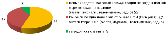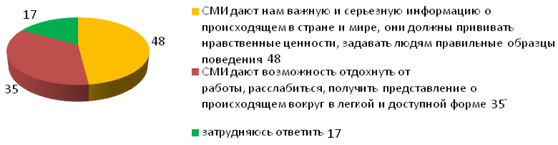 Россияне, как правило, считают современные СМИ разнообразными и способными удовлетворить даже самые взыскательные запросы (53%) (рис. 2). В представлениях о роли СМИ доминирует мнение, согласно которому они дают нам важную информацию и должны прививать нравственные ценности (48%). Большинство россиян уверены, что новые средства массовой коммуникации никогда не заменят прежние (55%) [10].