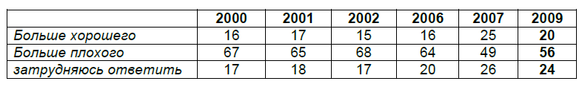 Совсем другой предстает ситуация с первым президентом (рис.1). Сегодня большинство россиян считают, что решение Ельцина о досрочной отставке и передачи власти преемнику В.Путину было во всех отношениях правильным (66%). Чаще всего наши сограждане заявляют, что заявление Ельцина о досрочной отставке вызвало у них удовлетворение (39%), однако в 2000 году таких респондентов было значительно больше (52%). Значительная группа опрошенных сообщает, что это событие не вызвало у них особых эмоций (32%, в 2000 году – 10%). Россияне склонны думать, что эпоха Ельцина принесла стране больше плохого. Но за последнее десятилетие доля считающих так значительно снизилась (с 67 до 56%) [10].