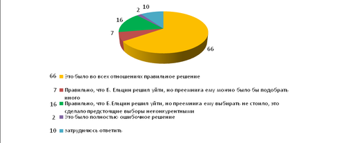 Рис. 1. Диаграмма распределения ответов на вопрос: «Ровно десять лет назад накануне нового 2000 года Борис Ельцин заявил, что уходит в отставку и передает власть своему преемнику В. Путину. Как Вы сегодня оцениваете это решение?» (закрытый вопрос, один ответ)
