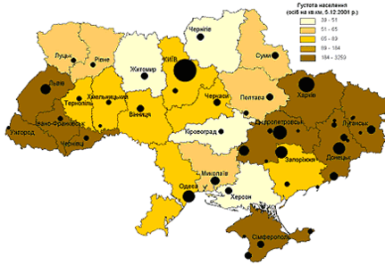 Рис.1.2 Густота населення України, осіб/кв.км