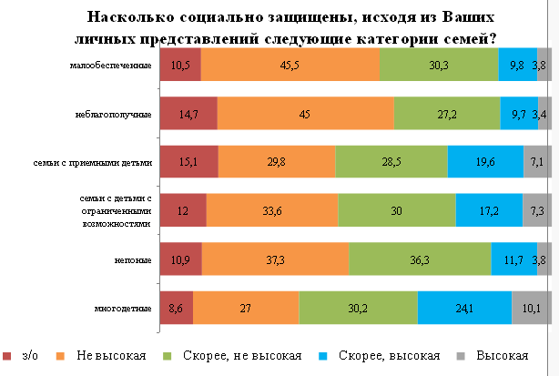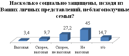 Очень большая группа респондентов полагает, что неблагополучные семьи в столице социально не защищены. 45% выбрали вариант ответа «не высокая» степень защищённости. 27,2% респондентов говорят о том, что степень защищённости «скорее, не высокая». Только около 13% от всей выборочной совокупности выбрали ответы о «высокой» либо «скорее, высокой» степени защищённости.