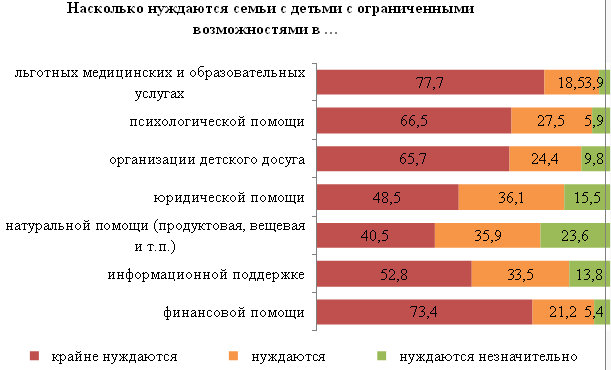 Семьи с детьми с ограниченными возможностями, по мнению респондентов, в наибольшей степени нуждаются в финансовой помощи (73,4%) и льготных медицинских и образовательных услугах (77,7%), а наименее всего – в юридической помощи (48,5%) и натуральной помощи (40,5%).