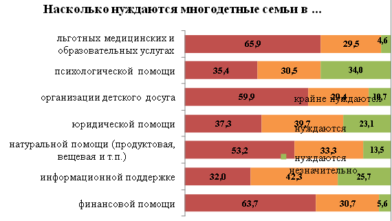 На представленной диаграмме отчётливо видно, что с точки зрения большинства респондентов многодетные семьи достаточно сильно нуждаются во всех перечисленных видах помощи и поддержки. Например, более 60% полагают, что данной группе остро необходима финансовая помощь, а также льготные медицинские и образовательные услуги. Ещё около 30% отмечают высокий уровень необходимости оказания всех перечисленных видов помощи данным семьям. Также высокую актуальность, по мнению респондентов, имеет оказание натуральной помощи (вещами, продуктами) многодетным семьям.