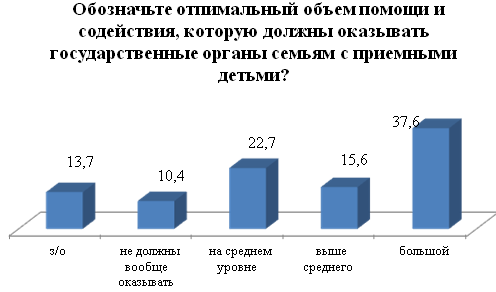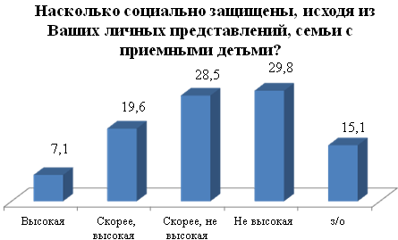 При оценке социальной защищённости семей с приёмными детьми выявился несколько меньший процент (по сравнению с предыдущими вопросами) респондентов, считающих его уровень не высоким. Суммарный показатель ответов («скорее, не высокая», «не высокая») в данном случае составляет 58,3%. Обращает на себя внимание тот факт, что 19,6% респондентов представляется, что, скорее, этот уровень является высоким. На наш взгляд, это связано с тем, что возможность усыновить ребенка воспринимается как привилегия обеспеченных семей, у которых есть возможность найти дополнительные деньги на его содержание.