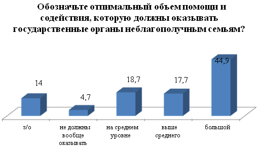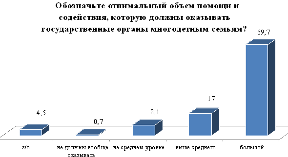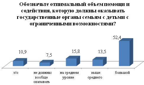 Более половины респондентов считает, что государственные институты должны оказывать большой объём помощи семьям с детьми с ограниченными возможностями. Следует отметить, что заметной является группа респондентов, которые считают, что семьям данной группы государство вообще не должно оказывать никакого содействия и поддержки. Данной точки зрения придерживается 7,5% респондентов. В целом, жители столицы более скептически настроены в вопросе актуальности помощи семьям с детьми с ограниченными возможностями, чем многодетным семьям. Это обстоятельство недвусмысленно указывает на отношение к проблеме инвалидов, сложившееся в обществе на данный момент