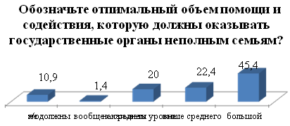 При оценке актуальности поддержки неполных семей респонденты менее категоричны, как это было при оценке значимости поддержки многодетных семей. В данном случае на необходимость большого объёма помощи со стороны государства указывает 45,4% участников исследования. 20% респондентов считает, что эта помощь должна оказываться на среднем уровне. Затруднилось с ответом на этот раз в двое большее число граждан – 10,9%.