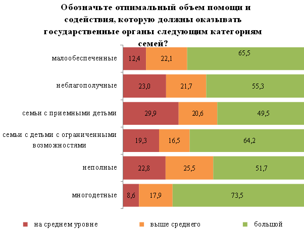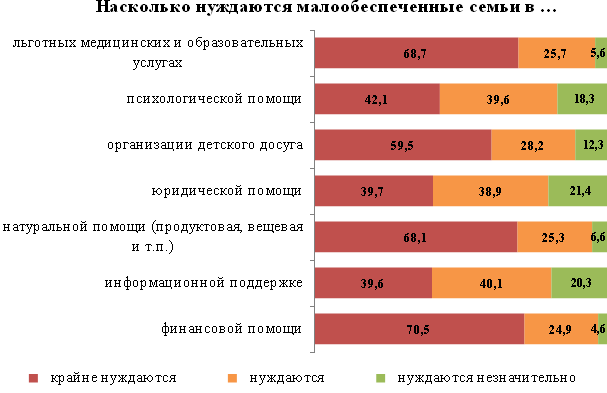 Стоит подчеркнуть, что с точки зрения респондентов, для малообеспеченных семей важна практически любая помощь и поддержка. В этом плане данная группа является более социально незащищённой и нуждающейся, чем семьи других рассматриваемых групп.