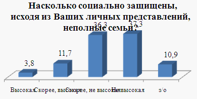 Большая часть москвичей, принявших участие в опросе, считает, что неполные семьи имеют слабую социальную защищённость. Варианты ответа «скорее, не высокая» и «не высокая» в сумме выбрали 73,6% респондентов. При этом крайне мал процент тех, кто считает, что неполные семьи имеют высокую степень социальной защищённости (3,8%). Затруднившихся с ответом на поставленный вопрос в итоге оказалось 10,9%, что является достаточно высоким показателем.