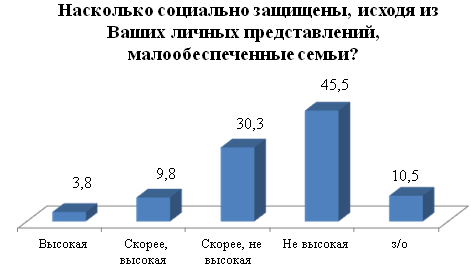Исходя из своих личных представлений, 45,5% респондентов полагает, что уровень социальной защищённости малообеспеченных семей не высокий. Подчеркнём, что это самый ярко выраженный показатель данного варианта ответа. Ещё 30,3% сомневаются, но, скорее, склоняются к такому же варианту ответа. В сумме 75,8% респондентов считают, что малообеспеченные семьи в столице имеют не высокую защищённость, что говорит о необходимости усиления содействия данной группе семей.