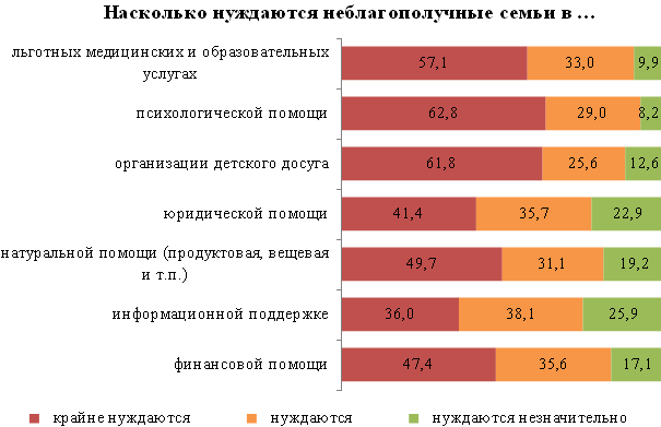 Низко респонденты оценивают потенциал информационной поддержки неблагополучных семей. Также не высоко оценивается актуальность юридической помощи («крайне актуальна» - 30,9%, «не нуждаются» - 12%).