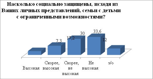 Как и в предыдущем вопросе, общественное мнение склоняется к той точке зрения, что семьи с детьми с ограниченными возможностями имеют не высокий уровень социальной защищённости. В сумме 63,6% выбрали варианты ответа («скорее, не высокая», «не высокая»), что свидетельствует о необходимости усиления поддержки семей данной группы и увеличении информационного освещения данной темы со стороны органов власти и управления.