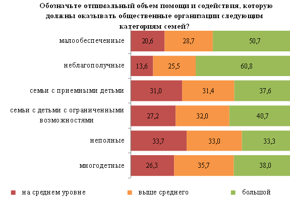 Общественные организации, с точки зрения респондентов, должны в целом оказывать значительный объём помощи социально уязвимым группам семей. В большей степени, по мнению опрошенных москвичей, в данной помощи нуждаются малообеспеченные («большой» - 43,9%) и неблагополучные семьи («большой» - 55,1%). Только около 2% респондентов считают, что общественные организации данным семьям не должны оказывать никакой помощи вообще. Полученные результаты свидетельствуют о том, что население в целом положительно относится к деятельности общественных организаций и не возражает против того, чтобы они оказывали помощь социально незащищённым семьям.