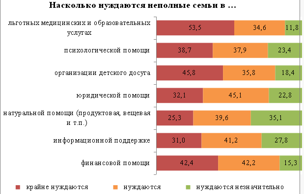 Менее актуальной помощью неполным семьям респондентам видится информационная поддержка, а также натуральная помощь (около 20% ответивших выбрали вариант «крайне нуждаются»).