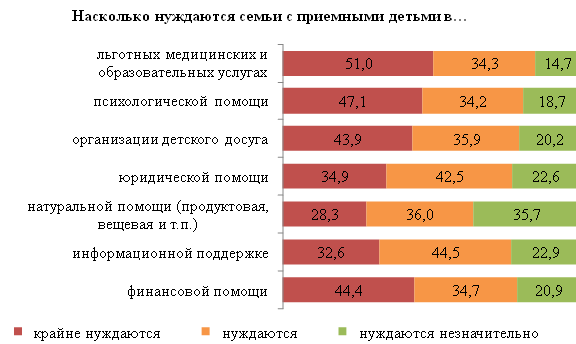 Семьи с приёмными детьми в большей степени нуждаются льготных медицинских и образовательных услугах. 44,5% респондентов считают, что они крайне нуждаются в подобной помощи. Также респонденты полагают, что для данной категории семей крайне актуальна психологическая помощь («крайне нуждаются» - 39,7%), а также организация детского досуга («крайне нуждаются» - 37,5%). Обращает на себя внимание тот факт, что до этого данные виды помощи не являлись наиболее актуальными с точки зрения принимавших участие в опросе.
