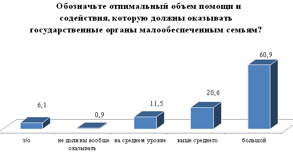 Подавляющее большинство населения считает, что органы государственной власти должны оказывать большой объём помощи малообеспеченным семьям. Так считает 60,9% респондентов. Ещё 20,6% москвичей придерживаются мнения, что объём помощи должен быть выше среднего. Менее одного процента респондентов говорят об отсутствии актуальности поддержки семей данной группы со стороны органов власти. В целом необходимо отметить, что к малообеспеченным семьям в обществе присутствует значительное сочувствие и понимание того, что данной группе необходима помощь и поддержка.