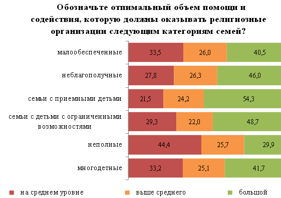 При оценке помощи социально незащищенным семьям со стороны религиозных организаций респонденты более сдержанны. 39,4% считают, что в помощи данных субъектов наиболее нуждаются семьи с приёмными детьми, а также семьи с детьми с ограниченными возможностями («большой объём помощи» - 34,2%). Менее нуждаются в поддержке религиозных организаций неполные семьи, так как только 17,7% считают, что они должны получать от них большой объём помощи, а 17,4% уверены, что религиозные организации не должны вообще оказывать помощь таким семьям.