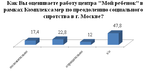 Почти половина респондентов (47,8%) не смогла оценить работу центра «Мой ребёнок» в рамках Комплекса мер по преодолению социального сиротства. Данный результат свидетельствует о необходимости информирования населения о тех институтах, которые ориентированы на поддержку социально незащищённых семей.