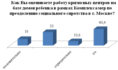 40,4% респондентов не смогли оценить работу кризисных центров на базе домов ребёнка. Каждый третий респондент (33%), который информирован о программе Комплекс мер по преодолению социального сиротства, оценивает результаты работы кризисных центров на базе домов ребёнка удовлетворительно. Положительно данный институт оценивает 16% москвичей, принимавших участие в исследовании.