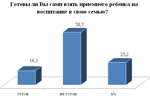 Обращает на себя внимание тот факт, что почти каждый четвёртый респондент затруднился при ответе на поставленный вопрос. Это свидетельствует о том, что группа лиц, потенциально готовых взять в свою семью приёмного ребёнка на воспитание, может увеличиться. Для многих респондентов данный вопрос является сугубо личным, поэтому они склонны уклоняться от ответа.