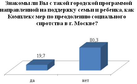 Городская программа, направленная на поддержку семьи и ребёнка, - Комплекс мер по преодолению социального сиротства в г. Москве известна 19,7% москвичей, принимавших участие в исследовании. 80,3% респондентов не знакомы с данной программой, что может свидетельствовать о необходимости её дополнительной информационной поддержки.