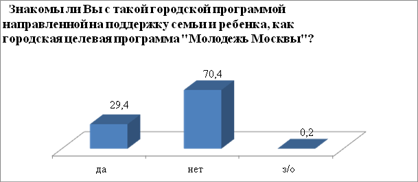 Почти каждый третий москвич (29,4%) знает о такой программе, как «Молодёжь Москвы». Данный результат следует признать хорошим, что свидетельствует о реальной востребованности реализуемой программы.