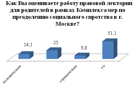Более половины респондентов (51,1%) затруднились при оценке правового лектория для родителей в рамках Комплекса мер по преодолению социального сиротства. Каждый четвёртый респондент оценивает данный институт удовлетворительно. Отрицательных оценок деятельности правового лектория в итоге оказалось только 9,8%.