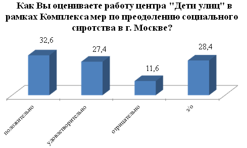 Работу центра «Дети улиц» большая часть респондентов оценивает положительно. Соответствующий вариант ответа выбрали 32,6% москвичей, отвечавших на вопросы анкеты. Среди тех, кто знает о Комплексе мер по преодолению социального сиротства в г. Москве, 11,6% респондентов высказали отрицательные оценки. Значительная группа граждан (28,4%) затруднилась при ответе на поставленный вопрос.