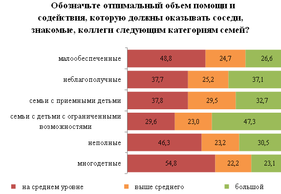 В целом соседи, знакомые, коллеги, по мнению респондентов, семьям перечисленных категорий должны оказывать помощь на среднем уровне. Данный ответ является наиболее популярным у жителей города. В среднем его значение составляет около 30%. По-прежнему, не малая группа участвовавших в мониторинге москвичей считает, что данная помощь должна оказываться в объёме выше среднего и в большом объёме. Особенно это касается семей с детьми с ограниченными возможностями. 37,9% опрошенных выбрали вариант ответа «большой объём помощи».