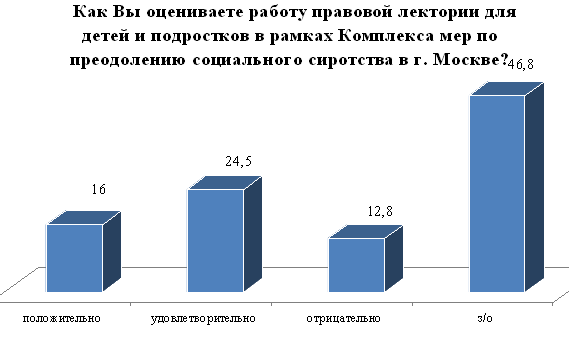 Оценки правового лектория для детей и подростков в рамках Комплекса мер по преодоления социального сиротства в г. Москве во многом повторяют предыдущий результат. Большинство респондентов (46,8%) не могут оценить работу правового лектория для детей и подростков.