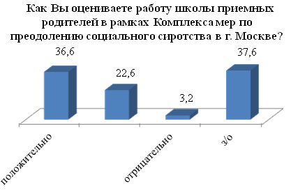 Наиболее популярным ответом при оценке результатов работы школы приёмных родителей в рамках Комплекса мер по преодолению социального сиротства является «затрудняюсь ответить» - 37,6%. Примерно такая же группа (36,6%) граждан положительно оценивает результаты работы школы приёмных родителей. Отрицательно данный институт оценивает только лишь 3,2% опрошенных респондентов.