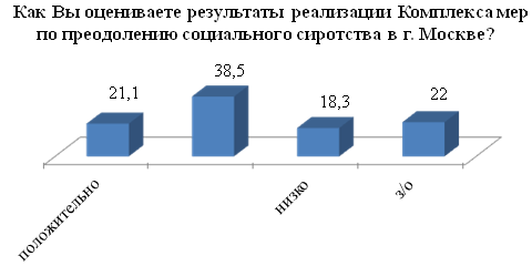 Среди тех, кто информирован о Комплексе мер по преодолению социального сиротства в г. Москве большая часть респондентов (38,5%) удовлетворительно оценивает результаты его внедрения. Положительных оценок реализации программы в итоге оказалось 21,1%, что больше, чем тот результат, который набрал вариант ответа «низко» (18,3%).