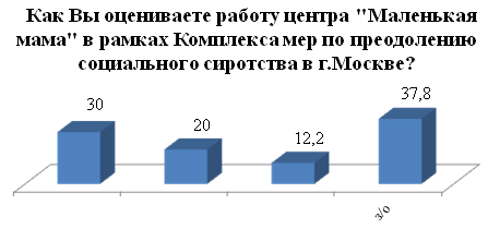 30% респондентов оценивает положительно работу центра «Маленькая мама», которая осуществляется в рамках Комплекса мер по преодолению социального сиротства. 12,2% опрошенных москвичей из тех, кто осведомлён о реализации данной программы, оценивает работу данных центров отрицательно. По-прежнему высок процент затруднившихся с ответом на поставленный вопрос (37,8%).