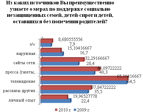 В диаграмме приведён сравнительный анализ результатов ответов респондентов на вопрос об источниках получения информации о мерах по поддержке социально незащищённых семей, детей-сирот и детей, оставшихся без попечения родителей в 2009 и 2010 годах. Стоит подчеркнуть, что результаты за год изменились не сильно. По-прежнему основным источником получения информации является телевидение (65% выбрали именно этот источник).